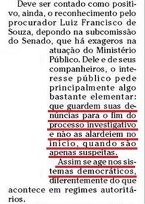 Ao analisar ações de membros do MPF que se aproximavam do gabinete presidencial, o mesmo editorial dizia ser “incorreto que se confundissem INDÍCIOS COM PROVAS, possibilidades com certezas e, acima de tudo, DESEJOS COM FATOS“.
